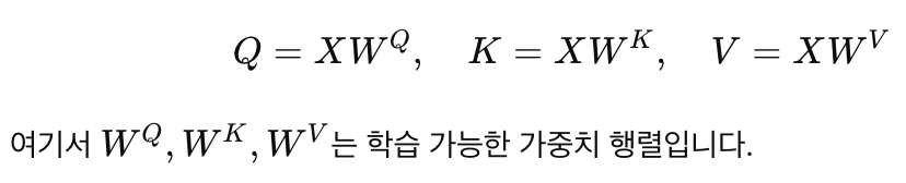 1. 쿼리(Query), 키(Key), 밸류(Value): 입력 벡터 XX에서 쿼리 QQ, 키 KK, 밸류 VV를 생성합니다.