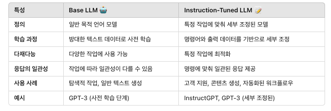 - Instruction-Tuned LLM은 특정 작업을 더 효과적으로 수행하도록 추가 세부 조정된 모델입니다. 🛠️ 추가 세부 조정 과정을 통해 특정 작업 응용 프로그램에서 향상된 성능을 제공합니다. 🚀