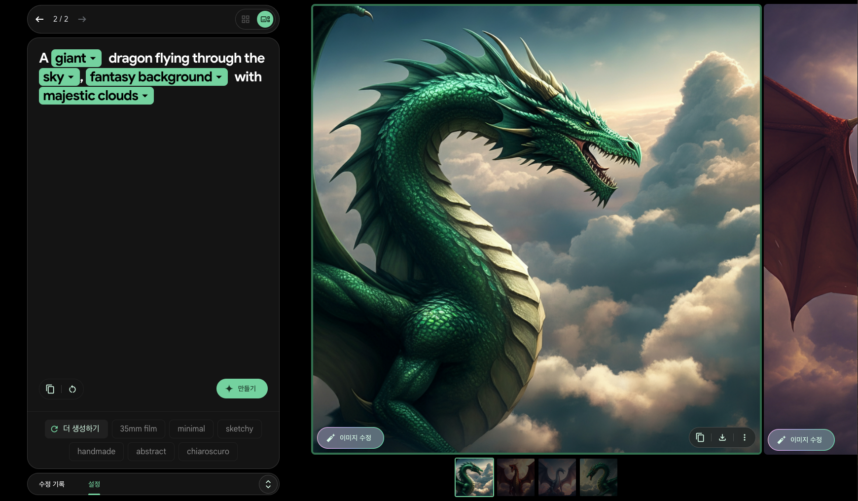 - 프롬프트 클릭으로 이미지 수정 🔄 이미지FX는 '표현 칩(Expressive Chips)' 기능을 통해 간단히 프롬프트를 클릭하는 것만으로도 생성된 이미지를 수정할 수 있습니다. 새로운 프롬프트를 입력하지 않고도 이미지의 스타일, 감정, 표현법 등을 쉽게 변경할 수 있어, 창의적인 아이디어를 계속해서 발전시키는 데 큰 도움이 됩니다.