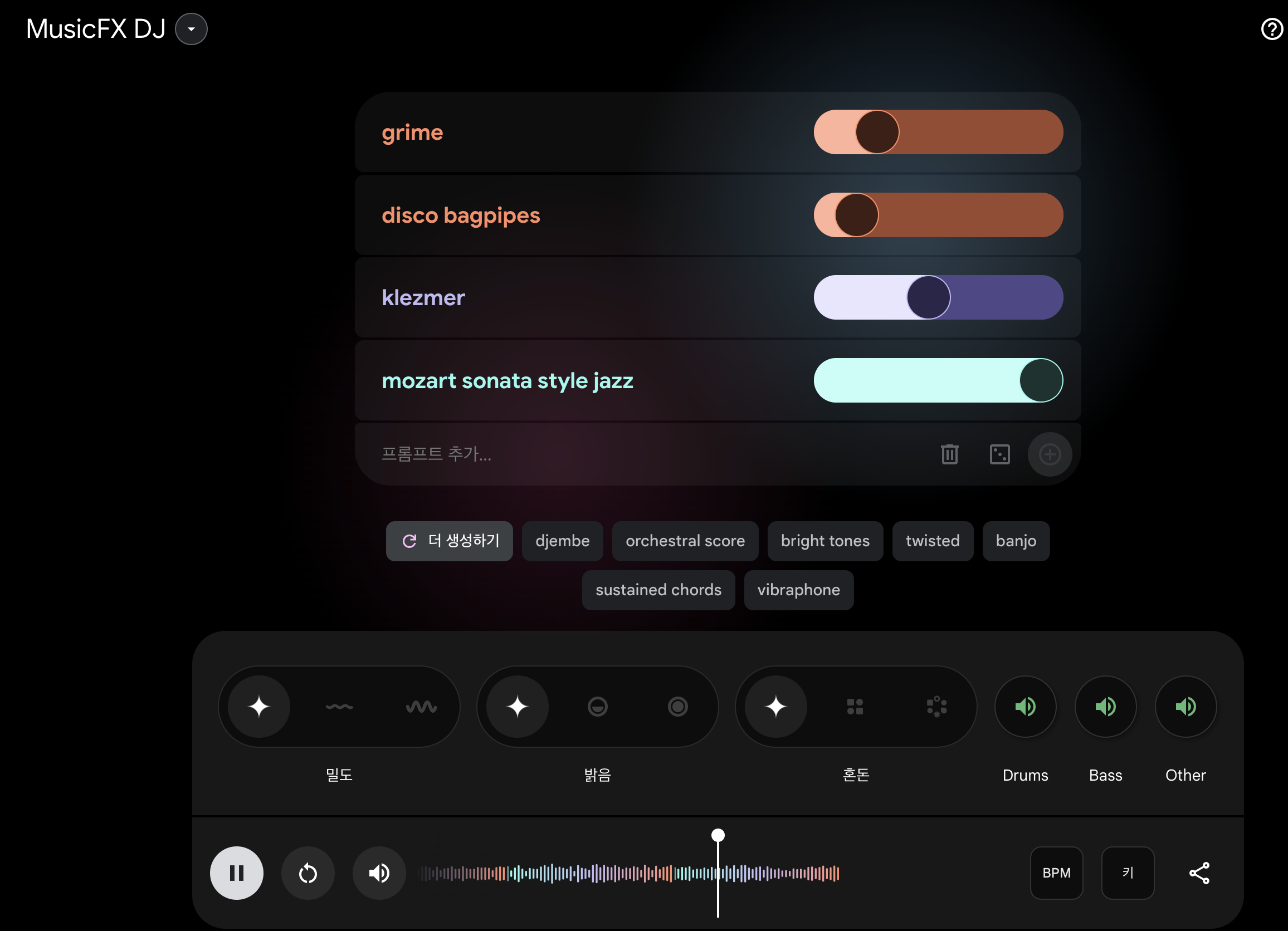 뮤직 FX DJ는 누구나 연속적인 음악 흐름을 창작할 수 있도록 도와주는 생성형 음악 도구입니다. 🎧 이 도구는 악기 🎻, 장르 🎶, 감정 😊 등과 같은 프롬프트를 혼합하여 사용자가 AI 기반의 잼 세션을 지휘할 수 있게 합니다. 이를 통해 창의적인 아이디어를 자극하고 개인 음악 창작에 샘플로 사용할 수 있습니다.
