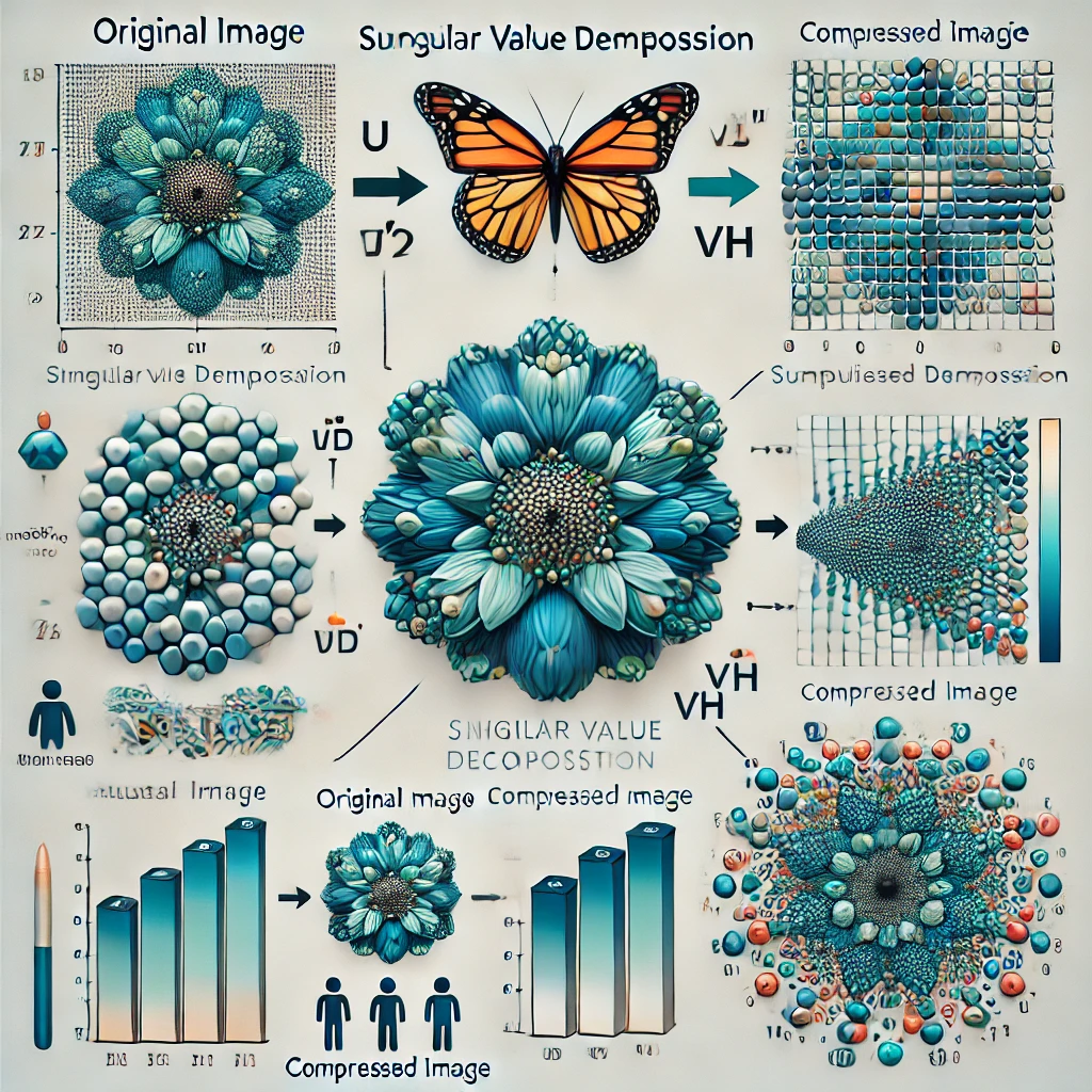 - SVD는 이미지를 압축할 때도 사용됩니다. 이미지 데이터를 특이값을 기준으로 압축하고, 그 결과를 다시 복원하여 원본에 가까운 이미지를 생성할 수 있습니다.
