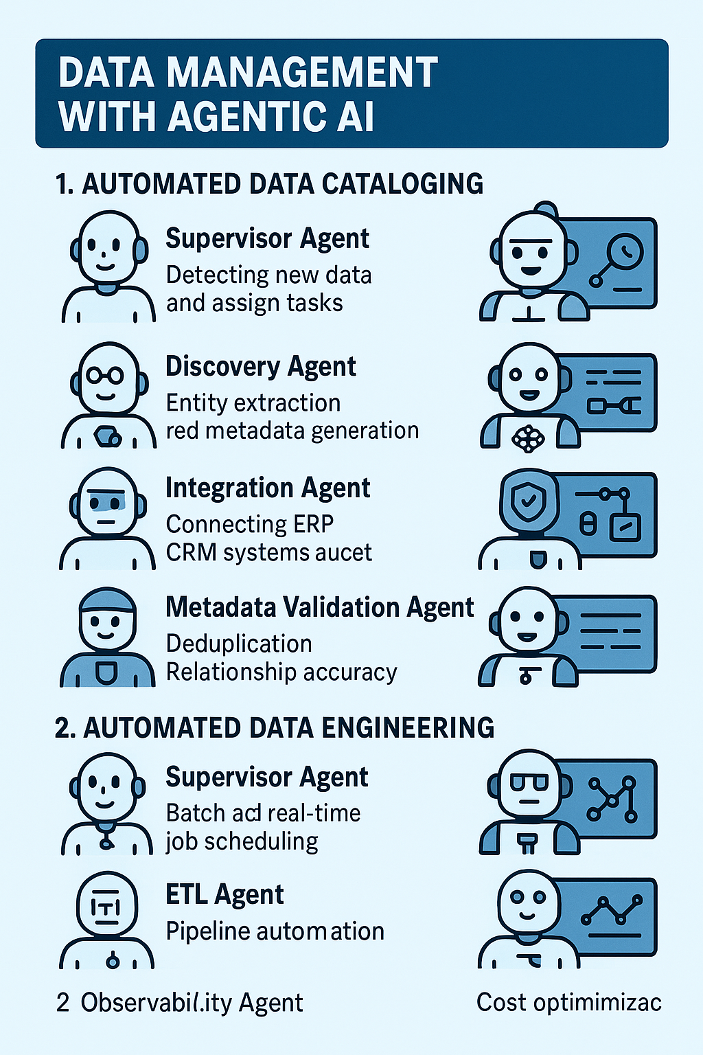 이러한 변화는 기업의 핵심 업무 중 하나인 데이터 관리(Data Management)에도 커다란 영향을 미치고 있습니다. 이번 글에서는 Debmalya Biswas의 글을 기반으로, Agentic AI가 어떻게 기업의 데이터 카탈로깅(Data Cataloging)과 데이터 엔지니어링(Data Engineering)을 재편할 수 있는지 살펴보겠습니다.