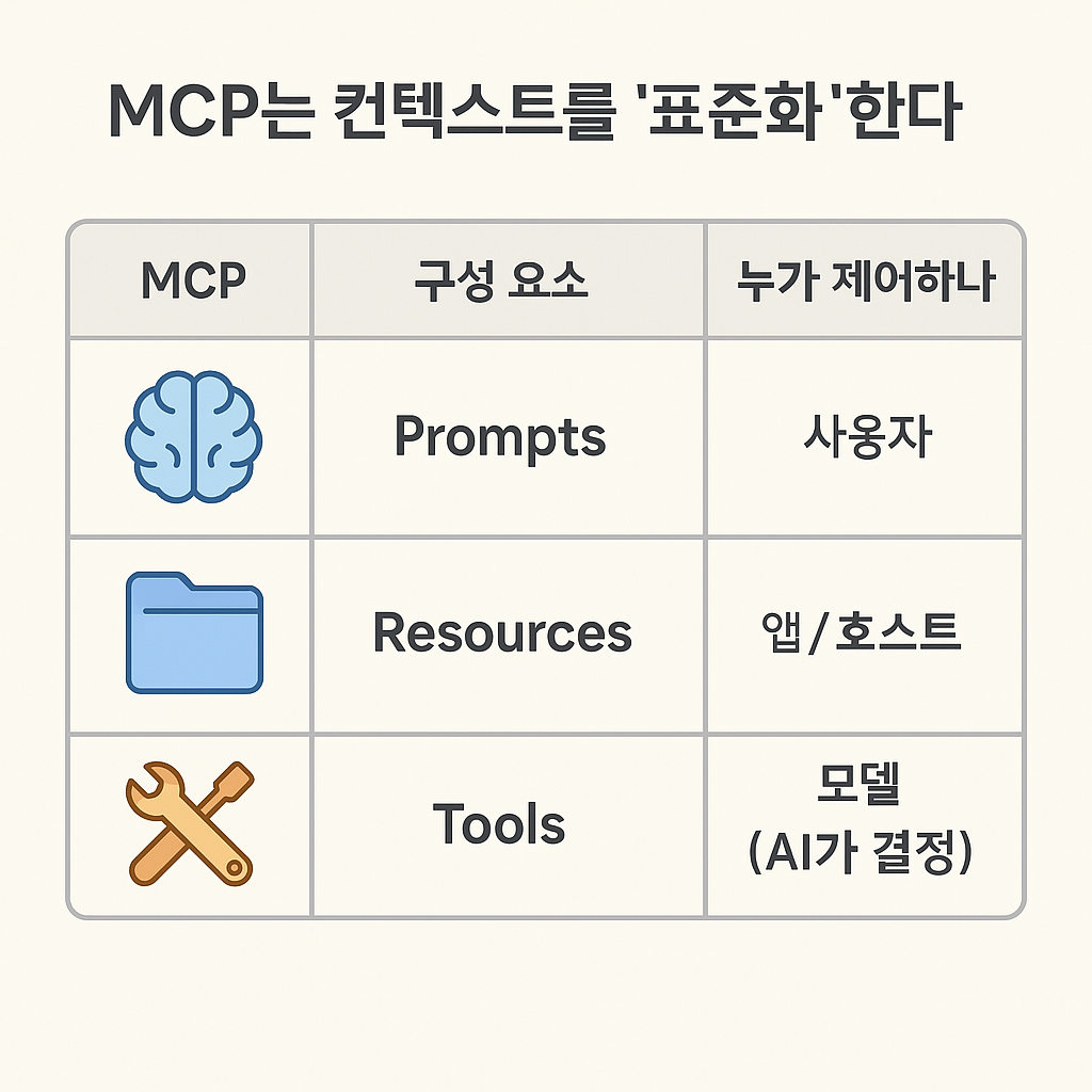 MCP는 이 문맥(Context)을 세 가지로 분류해서 구조화된 방식으로 전달할 수 있게 만들어줍니다.