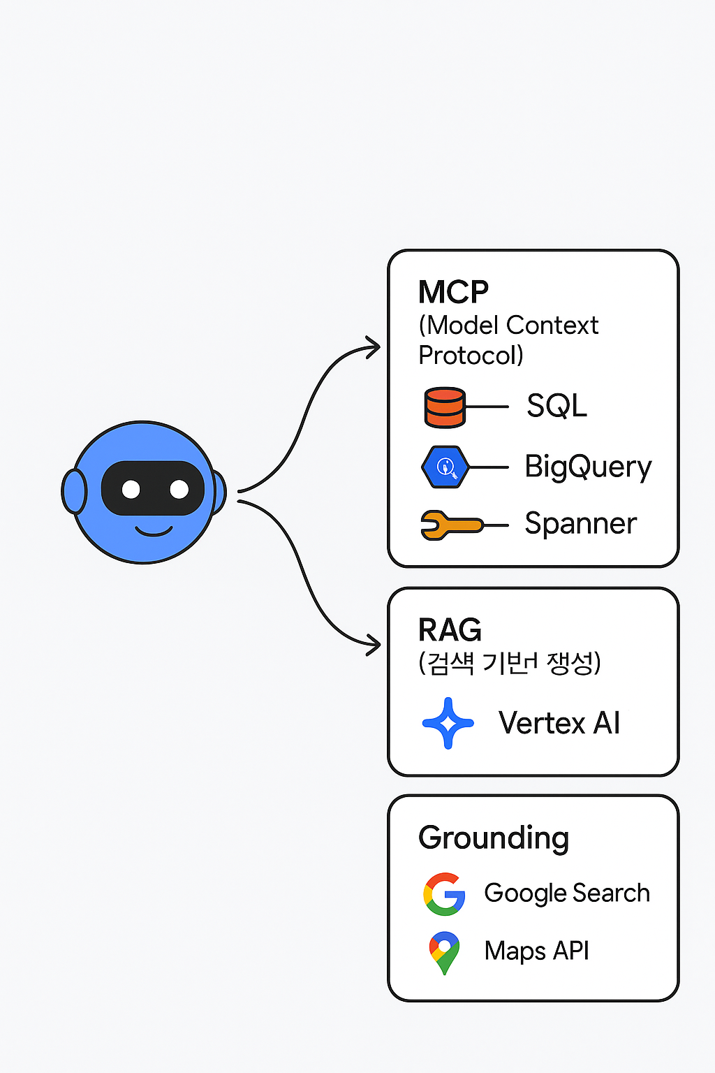 - MCP (Model Context Protocol): 에이전트가 SQL, BigQuery, Spanner 등 데이터베이스와 연결되게 해줍니다.