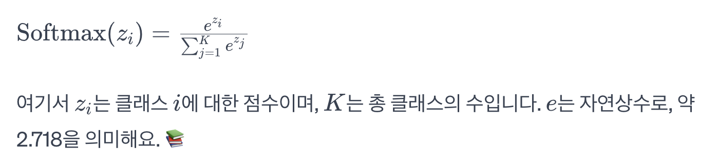 소프트맥스 함수는 각 클래스에 대한 예측된 점수를 확률로 변환하는 데 사용됩니다. 수학적으로는 다음과 같이 표현할 수 있어요: